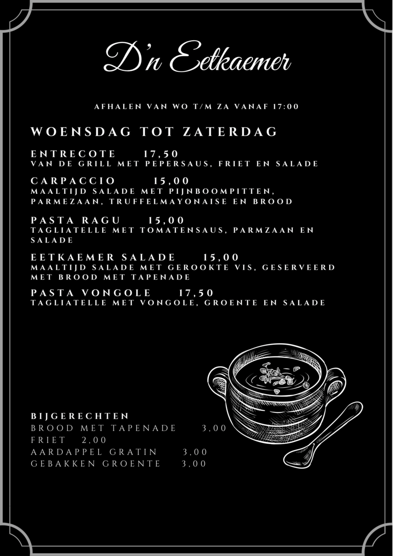 We zijn geopend van woensdag tot en met zaterdag vanaf 17.00. Bekijk hier naast ons wekelijks wisselende menu.